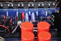 Fourteen are the power output devices, six the ISC Semiconductor 2SA1295 transistors polarized by a ISC Semiconductor 2SA1943, which works in push-pull configuration with six 2SC3264 driven by a ISC 2SC5200, with a power of 8 Ohms and 180 W. Rms, 4 Ohms and 350 W. Rms, up to the amazing power of 2 Ohms (0,4% thd ) and 600 + 600 W. Rms.