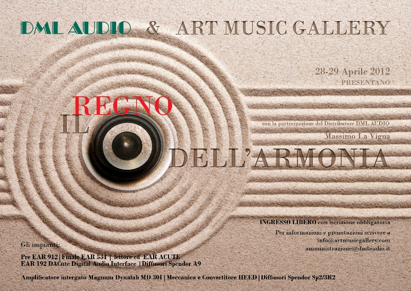 Art Music Gallery, nella sua incessante ricerca del bello, organizza in collaborazione con DML Audio e la partecipazione del suo rappresentante Dott. Massimo La Vigna un evento dedicato a tutti coloro che amano l'armonia nella vita.Armonia, questo è appunto il suo nome, si svolgerà i prossimi 28 e 29 aprile 2012 presso le sale di Floridia (SR-96014) di Corso Vittorio Emanuele 415 e Via Palestro 69. La manifestazione vedrà come protagoniste le elettroniche E.A.R Yoshino e in particolare il preamplificatore 912, il finale 534, il lettore CD Acute ed il nuovo DAC 192 che piloteranno i diffusori Spendor A9. L'impianto nella seconda sala sarà invece costituito dall'integrato Magnum Dynalab MD 301, meccanica e convertitore Heed Obelisk DT e Obelisk DA con i diffusori Spendor SP2/3R2.Non mancheranno le sorprese anche nel settore analogico.