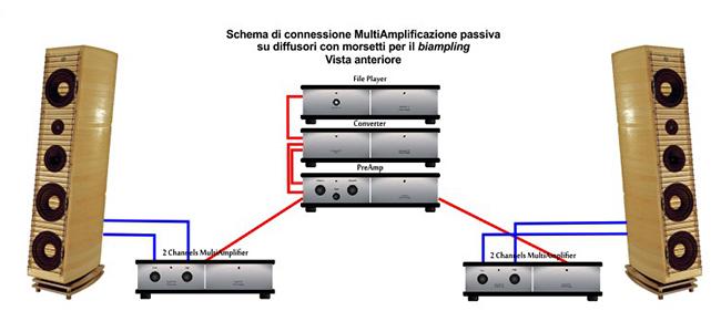 Da oggi però la multiamplificazione è facilmente realizzabile e disponibile per tutti. Al sistema di ogni appassionato, già presente nella sua sala d’ascolto, si aggiunge solo un finale stereo Blue Moon Audio Technology, il modello Amp X2-M, che possiede il controllo dei livelli di uscita. Il segnale in uscita dal pre, già presente nell’impianto, viene inviato al finale Amp X2-M che piloterà la gamma bassa dei due diffusori. Da questo finale una coppia di cavi porterà il segnale al finale, già presente nell’impianto, il quale si occuperà di amplificare la sola gamma medio-alta di entrambe le casse.