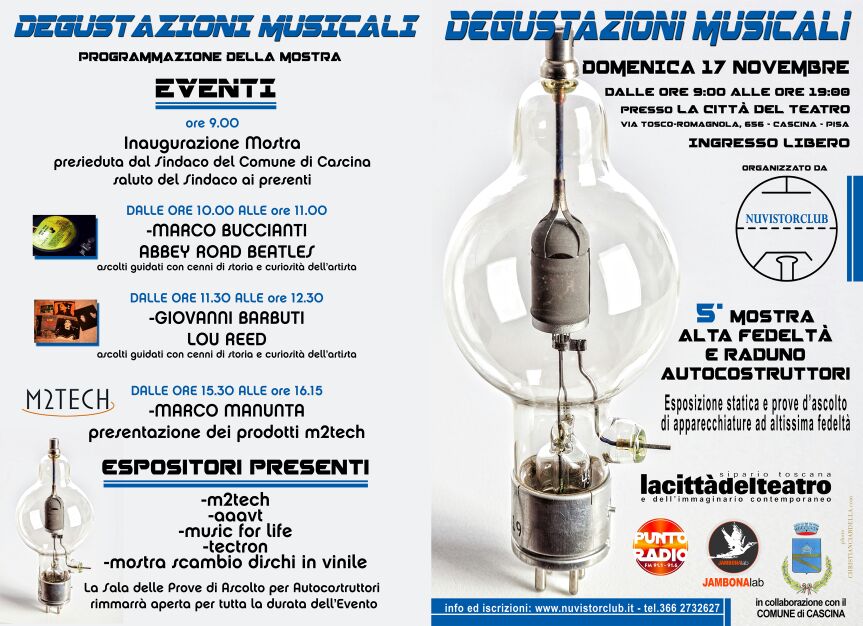 Quest'anno ci sono ricche novità: una nuova location, la Città del Teatro di Cascina, in provincia di Pisa, nostra attuale partner assieme al Comune di Cascina, lo studio di registrazione Jambona Lab e Punto Radio, entrambi sempre di Cascina. Questi nuovi spazi ci offrono ben sei sale a disposizione in cui ci saranno dimostrazioni sia di apparecchi audio commerciali presentati dalla aziende presenti come M2Tech, AAAVT e Music For Life, che apparecchi autocostruiti, sia dai soci del Nuvistorclub che da chiunque voglia divertirsi a mostrare al pubblico le proprie opere. Trovate sul sito le modalità di iscrizione, totalmente gratuita.Ricordiamo che la nostra associazione nasce proprio da un piccolo guppo di amici con la passione per la musica e l'audiocostruzione e si prefigge lo scopo di far incontrare tutte le persone con queste passioni, in modo da creare uno scambio di idee, opinioni ed esperienze tra i partecipanti finalizzato alla crescita degli individui in termini tecnici, culturali e personali.Durante la giornata ci saranno anche dei seminari e dei workshop su temi tecnici e musicali. Per finire, grazie a Tektron, ci sarà la possibilità di acquistare dischi e componenti elettronici.