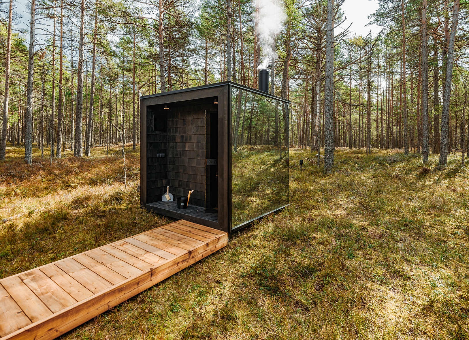 ÖÖD contributed the Mirror Sauna, a freestanding architectural design piece handcrafted in Estonia. With its mirrored façade and minimalist form, the sauna integrates seamlessly into its natural surroundings, embodying the balance between modern design, wellbeing, and nature.