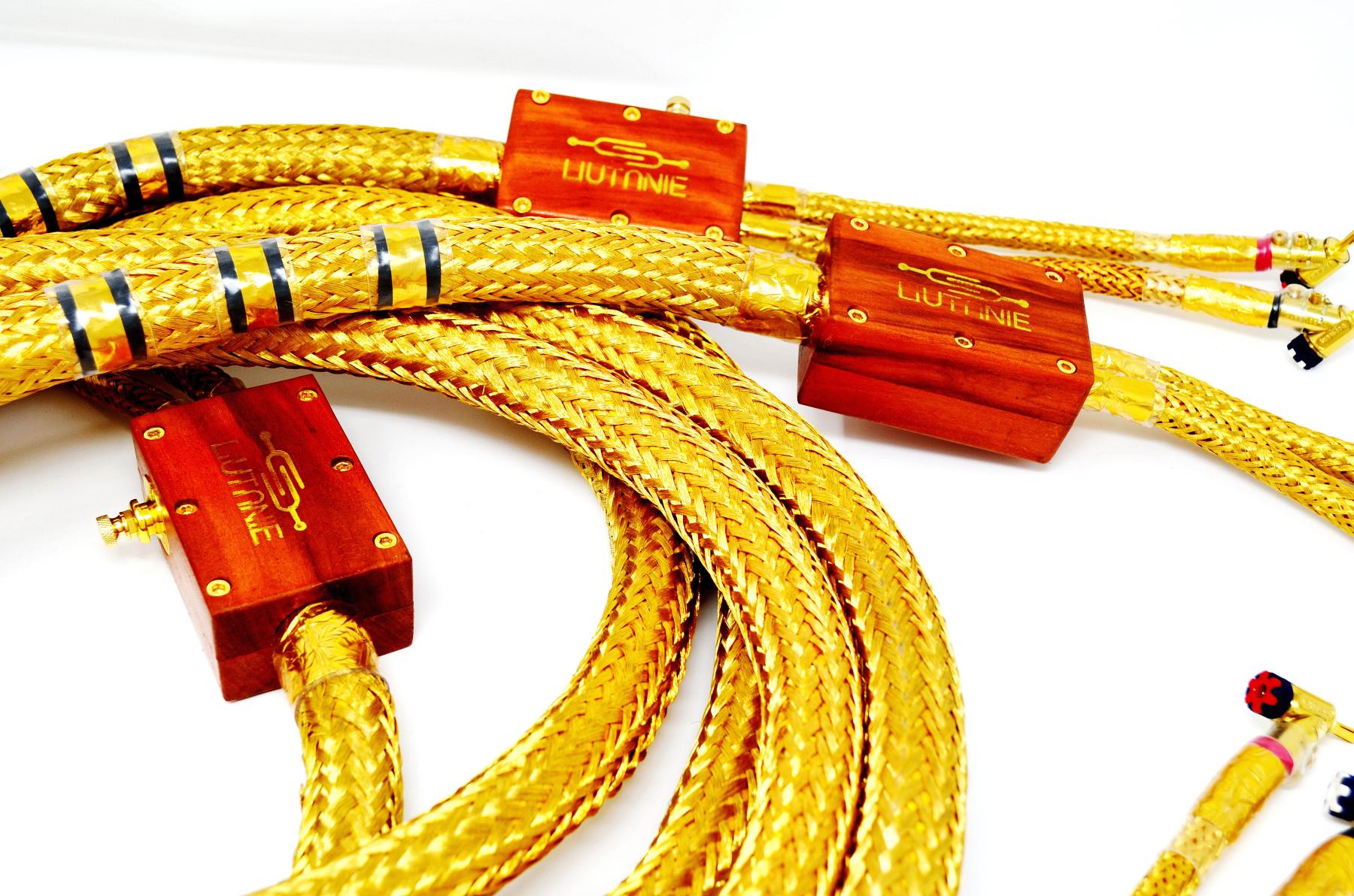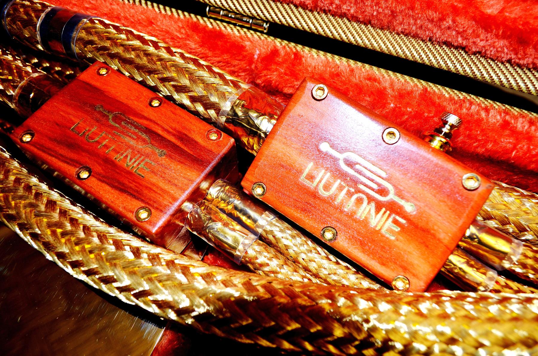 Il trittico di connessioni Liutanie Audio da me in esame, da poco presentate a grandi linee qui, è costituito da un cavo digitale coassiale, due coppie di cavi di segnale con terminazioni RCA – adatte a collegare fra loro, come nel mio caso, una sorgente, un convertitore, un preamplificatore e un finale di potenza – e da una coppia di cavi di potenza in configurazione mono-wiring. L’intero kit è contenuto in due lussuose custodie per chitarra in tessuto dorato, dotate di piedini da elettroniche sul fondo e chiusure a scatto con serratura e chiave di sicurezza, su cui spiccano delle eleganti placchette in metallo sulle quali è impresso il riuscito logo di Liutanie Audio.