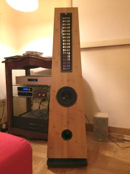 Le foto spiegano abbastanza bene la forma a piramide impiallacciata in bambù, scelta anche ecologica, che personalmente trovo piacevole e originale. Il midwoofer è montato a metà strada nel cabinet e il suo carico è accordato con un’apertura abbastanza ampia situata un po’ più in basso.